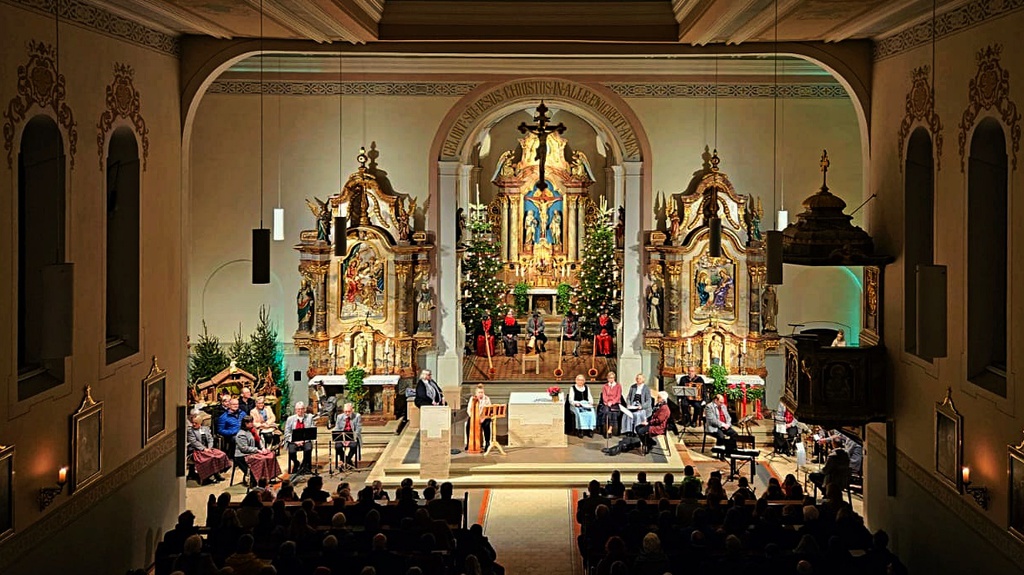 Unter der musikalischen Leitung von Musikdirektor Wilfried Thanner präsentierten verschiedene Bläsergruppen des Musikvereins Hörenhausen, Monika Schoenacker mit ihrer böhmische Volksharfe, die Flötengruppe sowie der Schulchor der Grundschule Orsenhausen-Sießen i. W., der Frauendreigesang aus Schwendi, der Orgelvirtuose Volker Unseld, die Panflötenspielerin Melanie Amann, die Rottumtaler Alphornbläser sowie Erwin Rupp mit der steirischen Harmonika eine eindrucksvolle Auswahl weihnachtlicher Lieder und festlicher Klänge. Hervorgehoben wurden die Gedanken zum Advent, die von der engagierten Elfi Weiß vorgetragen wurden. Das Publikum war begeistert und lauschte gebannt dem abwechslungsreichen Programm, das nicht nur traditionelle Weihnachtslieder, sondern auch Alpensounds und volkstümliche Melodien bot. Besonders hervorzuheben war die einzigartige Atmosphäre, die durch die musikalische Leitung von Wilfried Thanner geschaffen wurde. Er verstand es, ein „alpenländisches Flair“ zu vermitteln, das die Zuhörer in die festliche Stimmung eintauchen ließ.