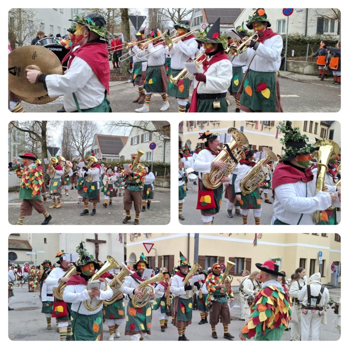 Für besondere Stimmung sorgten die Musikerinnen und Musiker des Musikverein Hörenhausen. Im eindrucksvollen Häs der „Waldgoischder und Walhexa“ reihten sie sich in den Umzug ein und begeisterten das Publikum mit schwungvollen Märschen und bekannten Fasnetsmelodien. Unter der Leitung von Wilfried Thanner zeigten die Musikantinnen und Musikanten nicht nur musikalisches Können, sondern auch echte närrische Spielfreude.